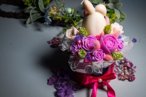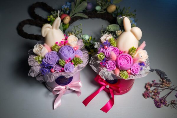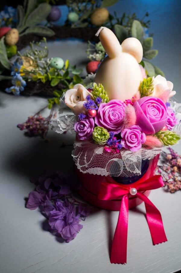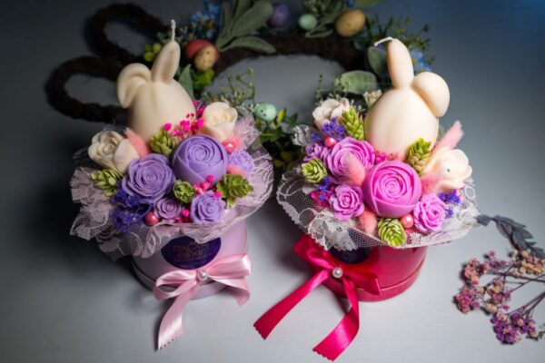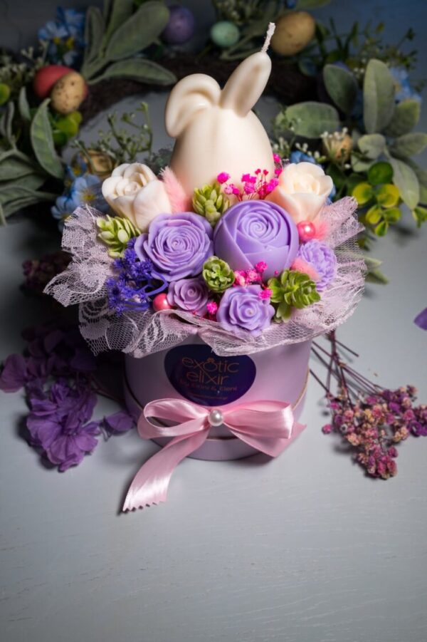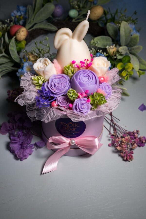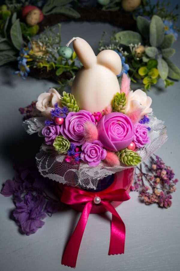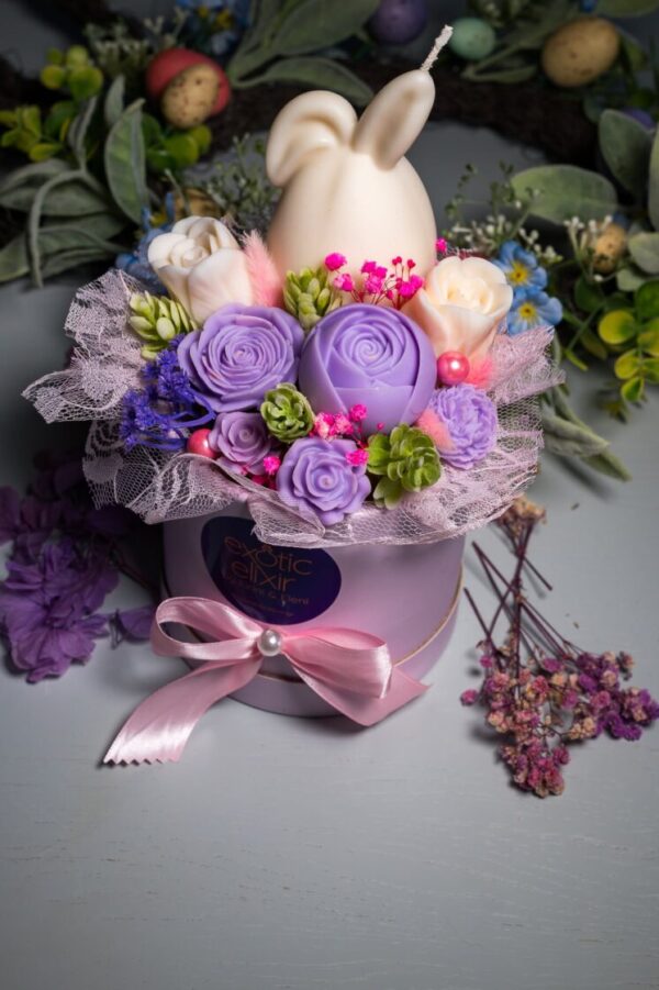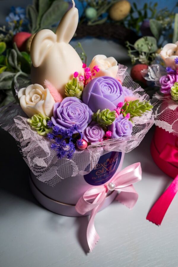 Μια ρομαντική, χειροποίητη κέρινη αρωματική σύνθεση που συνδυάζει κομψότητα και ανοιξιάτικη φρεσκάδα. Στο κέντρο δεσπόζει ένα διακοσμητικό κερί σε σχήμα λαγουδάκι, πλαισιωμένο από εντυπωσιακά κέρινα λουλούδια σε αποχρώσεις λιλά, ροζ και ιβουάρ. Η σύνθεση είναι τοποθετημένη σε κομψό κουτί δώρου, διακοσμημένο με δαντέλα και σατέν κορδέλα, δημιουργώντας ένα ολοκληρωμένο, πολυτελές αποτέλεσμα. Το άρωμα διαχέεται διακριτικά στον χώρο, χαρίζοντας αίσθηση φρεσκάδας και ζεστασιάς. Ιδανική πρόταση για πασχαλινό δώρο, για διακόσμηση σπιτιού ή για να προσφέρετε ένα ιδιαίτερο, αρωματικό στολίδι που θα εντυπωσιάσει από την πρώτη στιγμή. Διατίθεται σε 2 χρώματα: Λιλά/ Φούξια.