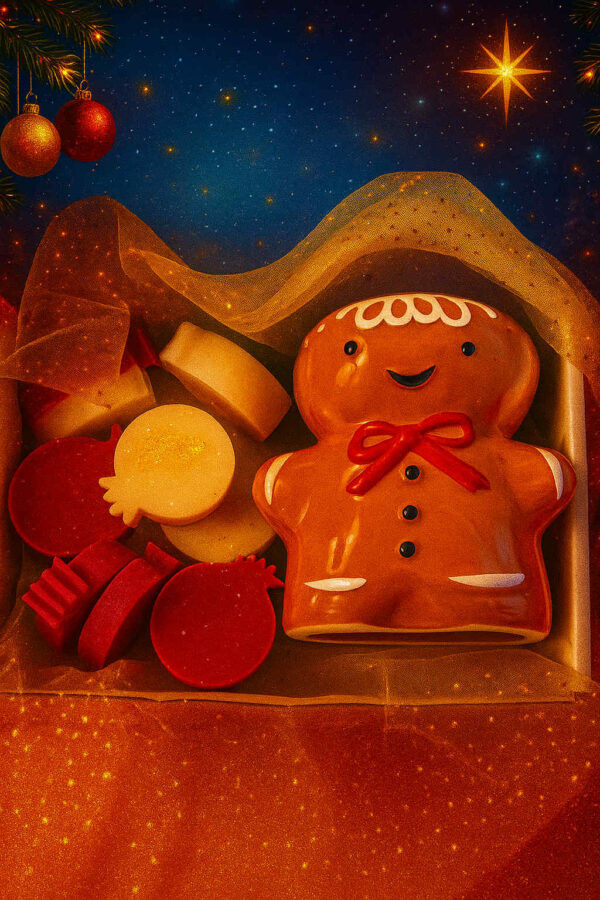 Φέρε τη μαγεία των Χριστουγέννων στο σπίτι σου με το Χριστουγεννιάτικο Σετ “Ginger Joy”! Ένα υπέροχο δώρο ή απόλαυση για εσένα, που περιλαμβάνει έναν κεραμικό καυστήρα σε σχήμα χαριτωμένου gingerbread man και μια συλλογή από χειροποίητα wax melts μικρά ρόδια σε υπέροχα χριστουγεννιάτικα αρώματα όπως κανέλα, βανίλια, γαρύφαλλο, ζεστό κρασί και μπισκότο. Τα wax melts λιώνουν απαλά πάνω στον καυστήρα, απελευθερώνοντας αρώματα που δημιουργούν μια ζεστή, γιορτινή ατμόσφαιρα και μετατρέπουν κάθε χώρο σε χριστουγεννιάτικο παραμύθι.