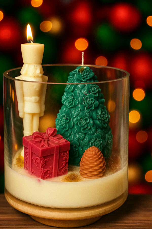 Μέσα σε μία κομψή γυάλα, ξετυλίγεται ένα γιορτινό σκηνικό με μοναδικά κεριά σε σχήμα χριστουγεννιάτικου δέντρου, δωράκι, κουκουνάρι και καρυοθραύστη – όλα προσεκτικά φτιαγμένα για να δημιουργήσουν την πιο ζεστή ατμόσφαιρα.