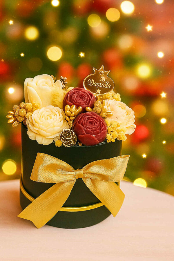 Η «Golden Delight» είναι μια εντυπωσιακή αρωματική κέρινη σύνθεση, φτιαγμένη στο χέρι με μεράκι και λεπτομέρεια. Οι καλλιτεχνικά διαμορφωμένες κέρινες “ανθοδέσμες” σε αποχρώσεις του κρεμ, του μπορντό και του χρυσού χαρίζουν μια αίσθηση πολυτέλειας και ζεστασιάς. Με μοναδικό άρωμα μελομακάρονο, γεμίζει τον χώρο με γλυκές, γιορτινές νότες μελιού, καρυδιού και κανέλας, δημιουργώντας ατμόσφαιρα θαλπωρής και νοσταλγίας. Το μαύρο κουτί με τη σατέν χρυσή κορδέλα ολοκληρώνει την elegant εμφάνιση, καθιστώντας τη σύνθεση ιδανική για: